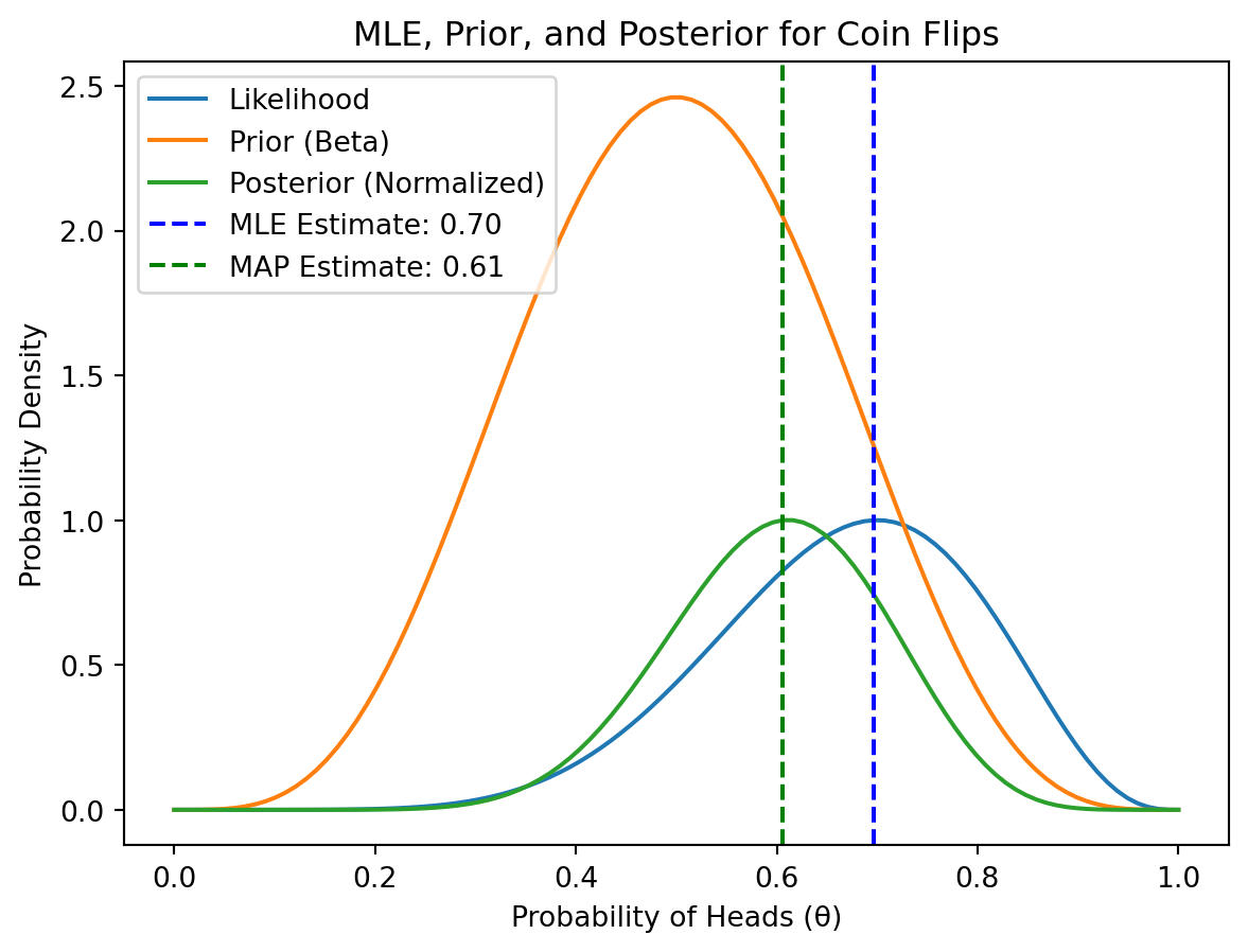 Maximum A Posteriori (MAP) Estimation: MAP estimation builds upon MLE and incorporates prior knowledge about the parameters using Bayesian principles. It seeks the parameter values that maximize the posterior probability, balancing the information from the observed data (likelihood) with our prior beliefs. For example, suppose you have a prior belief that the coin is fair. In this case, MAP estimation would incorporate this prior information. Using a suitable prior distribution that reflects this belief, MAP would estimate a probability of heads that’s somewhere between the MLE estimate (0.7) and the prior belief (slightly less than 0.5), depending on the strength of the prior and the observed data. Formally, the MAP estimate of parameters \(\theta\) is: